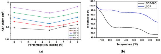 (a) Effect of varies nickel oxide loading content on LSCF cathode towards the area specific resistance (ASR) of the symmetric cell. (b) Thermal analysis of bare LSCF vs. LSCF with 5 wt% NiO powder from room temperature to 800 °C.