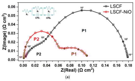 The electrochemical analysis of the LCF-NiO modified electrode was performed using a symmetric cell GDC electrolyte at an operating temperature of 800 °C, as shown in Figure 2a. In the circuit, Ro represents the cathode’s ohmic resistance. R1 indicates the high frequency arc connected with the process of charge transfer, whereas R2 represents the low frequency arc related to the cathode’s oxygen absorption. CPE1 and CPE2 are constant phase elements for the respective arcs. Rp is the sum of the arc at high frequency and the arc at low frequency (Rp = R1 + R2). To facilitate comparison, Ro was subtracted from each arc, and the explanation was provided in terms of the ASR derived by Equation (3).