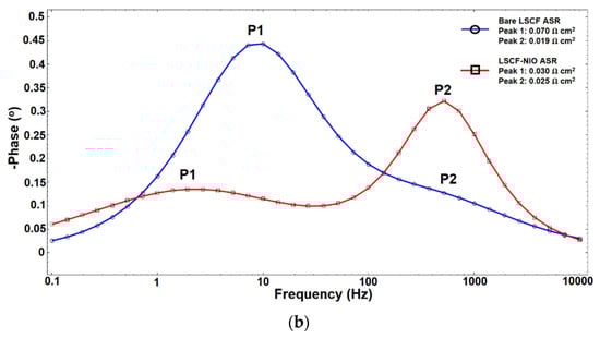 Further research was carried out on the low impedance resistance and high impedance resistance of bare LSCF and LSCF with 5% NiO at an operating temperature of 800 °C. Plot in Figure 4a revealed the polarization resistance with a deduction of resistance related to electrolyte and silver wire for clearer comparison. At an operating temperature of 800 °C, the addition of NiO toward the LSCF cathode can reduce the ASR from 0.09 Ω cm2 to 0.06 Ω cm2. In correlation, the bode phase plot in Figure 4b showed the position peak with the corresponding frequency of bare LSCF and LSCF-NiO. There are two peaks (P1 and P2) in the curve fit that correlate to the frequency of the Nyquist plots. The oxygen reduction reaction is represented by P1 (low frequency) and the charge transfer is represented by P2 (high frequency) during the triple boundary phase of the cathode [21,36,37]. It was observed that P1 (low frequency) reveals a substantial reduction of ASR from 0.07 Ω cm2 to 0.03 Ω cm2, which proves that the addition of 5 wt% nickel oxide improved the oxygen reduction reaction process and the triple boundary phase of the LSCF electrode [21]. In conjunction with this study, the ASR of P2 (high frequency) marginally increased from 0.019 Ω cm2 to 0.025 Ω cm2 after the addition of 5% nickel oxide due to the LSCF pore structure being obstructed by nickel oxide, which hindered charge transfer speed and bulk transport of oxide-ions at the cathode [38]. Despite a modest rise in the high frequency ASR (P2), the addition of nickel oxide massively enhances the ORR process, which reduces the ASR significantly from 0.09 Ω cm2 to 0.06 Ω cm2.