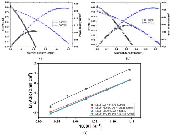 Figure 5a,b depict the performance of single-cell bare LSCF and LSCF with 5 wt% NiO at operating temperatures of 650 °C and 600 °C, respectively. Prior ASR research graphs previously demonstrated a significant increase in ASR value between 650 °C and 600 °C, while thermal analysis also confirmed the possibility of operating LSCF-NiO at 600 °C. Therefore, the performance analysis was performed at 650 °C and 600 °C to determine the power density at the lowest operating temperature for the intermediate temperature range. The power density of the LSCF rose from 0.22 Wcm−2 to 0.26 Wcm−2 after the addition of 5% nickel oxide. Single cells of bare LSCF and LSCF with 5 wt% nickel oxide were also conducted at an operating temperature of 600 °C for the purpose of temperature-based performance comparisons. The power density of bare LSCF fell from 0.22 Wcm−2 to 0.09 Wcm−2, resulting in a 59% fall in performance, whereas the LSCF-NiO single cell was reduced from 0.26 Wcm−2 to 0.15 Wcm−2, indicating a 47% performance reduction. This was consistent with the electrochemical data given previously, in which the ASR of bare LSCF increased dramatically at an operating temperature of 600 °C, while LSCF-NiO showed a slight drop in ASR at the same temperature. This demonstrates that LSCF-NiO is capable of operating at temperatures as low as 600 °C and that the addition of nickel oxide to the LSCF structure boosted the ORR process.