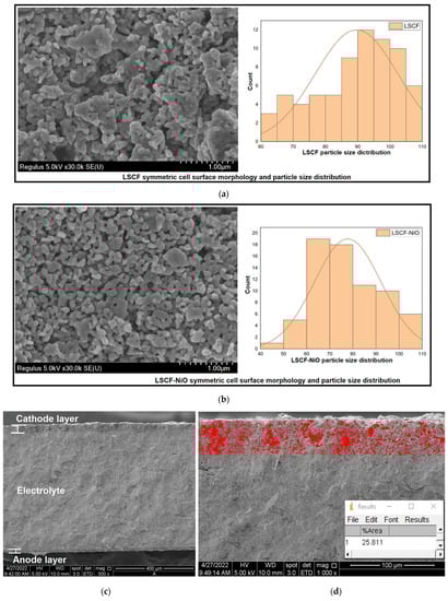 Figure 6a,b depict SEM micrographs of LSCF and LSCF-NiO on pellet surfaces. It was observed that LSCF and LSCF-NiO sintered at 1100 °C formed spherical particles that were well coupled to one another, resulting in a porous network [22,33]. It also exhibited a honeycomb-like structure, which is fundamental to the ORR process in a manner similar to that of other articles [39,40]. The concept behind the inclusion of metal oxide is that it will lessen the agglomeration effect, as shown in Figure 6b. Several articles related to the addition of metal oxide to the cathode also published these findings [3,41,42]. As O2− ions travel between the LSCF and NiO without traversing an air gap, the metal oxide will cover the gap and drive the ORR process [43]. It was demonstrated that the particle size distribution of LSCF-NiO is significantly more uniform in the range of 50 nm to 90 nm than that of LSCF, which ranges from 85 nm to 105 nm. This is due to the fact that nickel oxide ionic radii are substantially less than LSCF ionic radii, resulting in a smaller overall particle size (Ionic radii nickel = 0.69 Å, LSCF = 1.4 Å). Table 2 compares the crystal and particle size of bare LSCF and LSCF including 5 wt% nickel oxide.