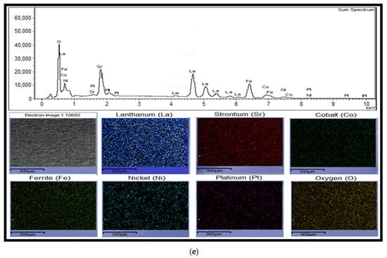 Further study was conducted towards cross-sectional image on LSCF-NiO/GDC/NiO-GDC single cell. Figure 6c depicts a well separated section of cathode, electrolyte, and anode. There is no delamination occurring between the cathode and electrolyte layer, indicating a sufficient sintering temperature (1100 °C) between the electrolyte and anode layer as well (1200 °C). In depth, the porosity of the cathode has been identified to be 25.81% in Figure 6d, which concludes a good amount of porosity subjected towards the nominal SOFC cathode [34]. As illustrated in Figure 6e, the existence of the element was confirmed by EDX and mapping analysis. The presence of lanthanum, strontium, cobalt, ferrite, nickel, and oxygen peaks on the pellet surface suggested that LSCF-NiO was manufactured using an enhanced modified process that produced a high purity sample. EDX mapping revealed that the element distribution on the cathode surface is uniform across the cathode layer. Platinum is present due to platinum coating for enhancing SEM/EDX resolution. It was also determined that no reaction between the cathode and electrolyte occurred after 1100 °C sintering, indicating that LSCF-NiO is chemically compatible with the GDC electrolyte.