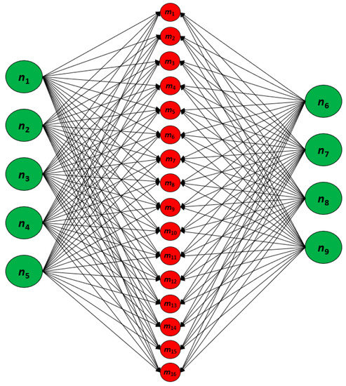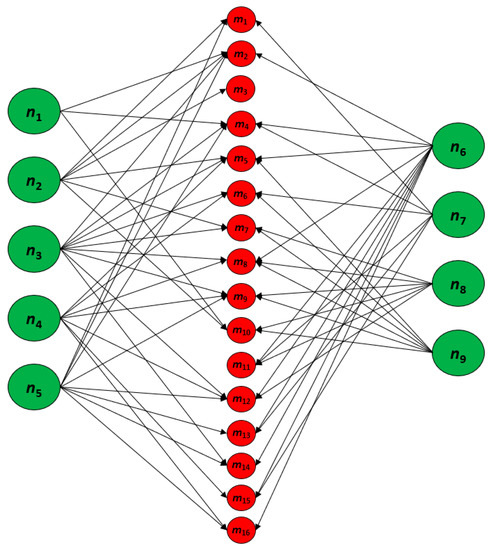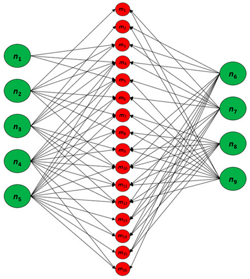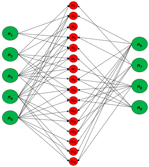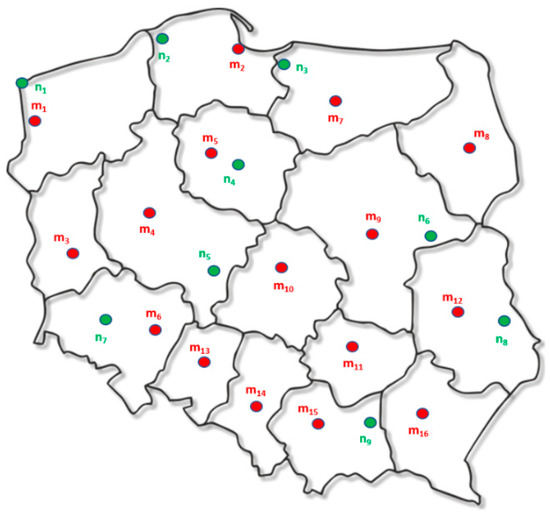 This article considers the distribution network including nodes located in the territory of the Republic of Poland. It consists of nine wholesalers (i.e., suppliers n1, n2, …, n9) and 16 retail stores (i.e., recipients m1, m2, …, m16) located geographically in voivodeship capital cities in Poland (Figure 2). The graph symbolizing the structure of the network reflecting all possible variants of transport is shown in Figure 3.