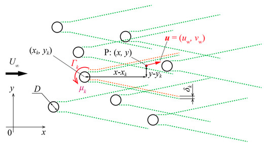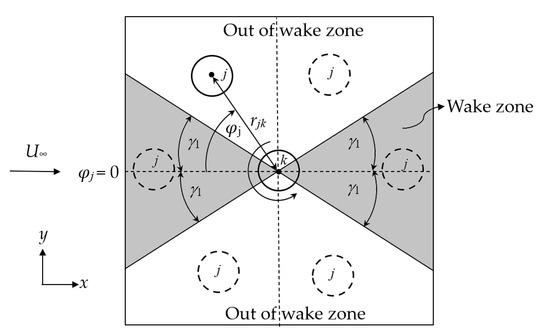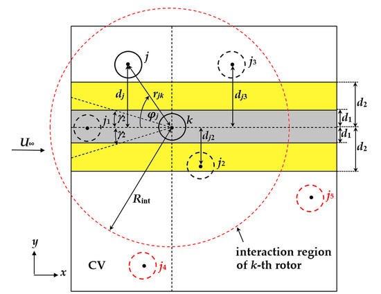 If an arbitrary set of circulations (Γk) of N rotors is given, a flow field and a set of rotor outputs are calculated by using Equations (2)–(7) and the prepared relation between the circulation and rotor power. However, the result is not always the actual correct condition. Therefore, we have to find out the set of circulations that give the condition satisfying the conservation of momentum expressed by Newton’s law of motion.