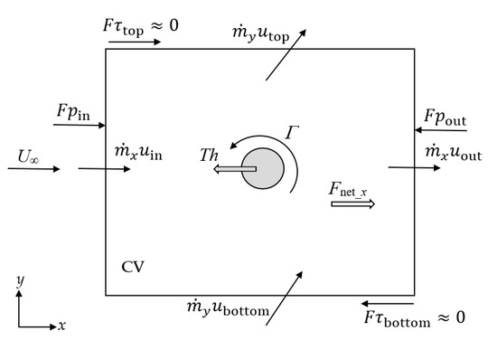 Figure 2 shows a schematic image of a control volume (CV) used for the calculation of the flow field around an isolated single rotor. The prepared data of an isolated single rotor, regardless of CFD data or experimental data, must satisfy Equation (8). The left-hand side of Equation (8) is the total force acting on the fluid in the