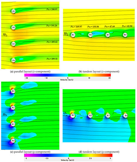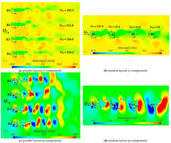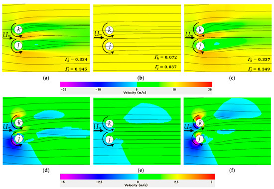 Figure 6b,e show the resultant flow field obtained by the proposed method using an in-house code, in which the circulation of each rotor was changed step by step in a round robin over a wide searching range from 0.1