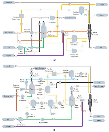 Simplified process configurations for (a) a Midrex process and (b) an Energiron III process. For ease of viewing, not all heat exchangers or heat integration are shown. Stream properties are defined in the Supplementary Materials (Tables S1 and S2).