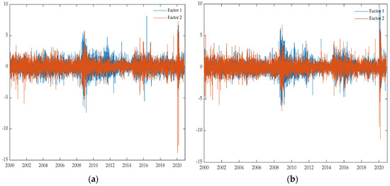 Figure 2 depicts the historical evolution of trends for the two common factors related to both crude oil and exchange rate returns. Then we find that the behavior of the common factors has a similar trend with macro-economic indicators over time: in particular, the large fluctuations have been identified in the period from 2008 to 2010, as well as in the year of 2020. Therefore, serious economic impact, such as from the global financial crisis and coronavirus disease 2019 (COVID-19), can lead to the significant volatility of the common factors related to the financial markets. To this end, the extracted common factors can be used to better characterize the overall macro-economic circumstance. These factors can affect the volatility of an individual market as well as the overall interdependence between crude oil and exchange rate markets directly and indirectly. Then we can capture the interdependence among markets and measure the extreme risks more precisely, conditional on the common factors.