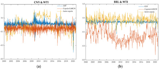We try to estimate the parameters and Kendall dependence coefficients of the five typical time-varying copula models based on the empirical results of the conditional distribution for the idiosyncratic factors corresponding to crude oil and exchange rate returns. The respective estimation results are shown in Table 3. We also compare the results from the factor copula model with the traditional Copula–GARCH model without consideration of their common factors. Furthermore, we compare the dynamic Kendall coefficients from the empirical distribution function (EDF), factor copula model and Copula–GARCH models. Taking China and Brazil as examples, Figure 3 presents the corresponding results about the interdependence between WTI returns and their exchange rate returns, respectively. Then we find that the proposed factor copula model can be considered as the better fitting model than the Copula–GARCH model to capture the dynamic dependence structure of crude oil and exchange rates returns.
