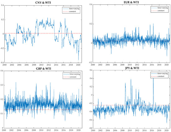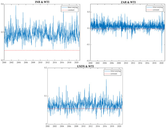 Figure 4 illustrates the respective dynamic Kendall dependence between crude oil and exchange rate returns conditional on the common factors, corresponding to each oil importer. We can also compare the time-varying value with their constant dependence. With the increasing financialization of the crude oil markets, the dependence between crude oil and exchange rate returns of oil importers can be characterized by alternative positive and negative values in the full sample period [2]. We also identified the different dependence patterns across the oil importers: as to the INR-OIL pair, it presents a positive dependence degree over time, with a mean value of around 0.3. Subsequently, the EUR-OIL, GBP-OIL and ZAR-OIL pairs exhibit positive dependence with slight fluctuation in all sample periods except during the financial crisis period. Furthermore, the USDX-OIL has also showed the positive dependence within the sample period, because the increase in prices of crude oil is only consistent with a slight appreciation of foreign currency against the USD [44]. In contrast, the exchange rates of other oil importers do not have a continuous positive dynamic correlation with crude oil prices. For example, the dependence coefficient of CNY to oil fluctuations has always been less than zero throughout most of the sample period.