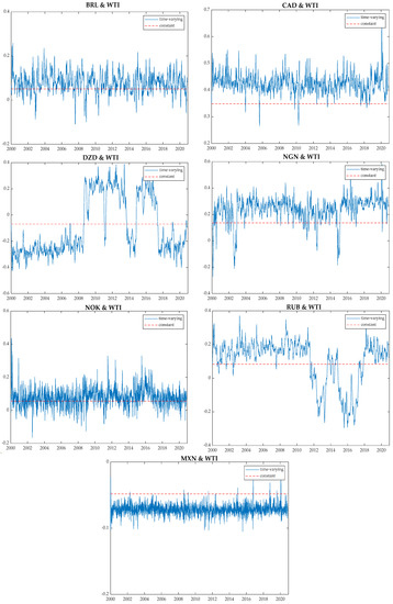 We have also found that the constructed time-varying t-copula model is more effective for capturing the dynamic dependence between crude oil and exchange rate markets for most oil-trading countries. Furthermore, the corresponding Kendall dependence is weak for all oil-exchange-rate pairs; nevertheless, the oil exporters’ exchange rates have relatively stronger links with crude oil prices than the oil importers. This finding is almost consistent with the overall sample results of Liu et al. [43]. The higher oil prices can transfer the wealth from oil importers to oil exporters, leading to the devaluation of the currencies of oil importers; however, the currencies of oil exporters will be appreciated instead. Then we identified the positive dependence with exchange rates of oil importers but negative dependence with those of oil exporters.
