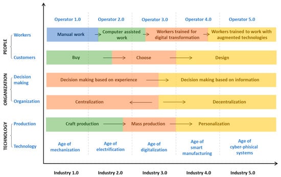 In the last decade, we have been witnesses of transformations inside production systems, especially in the field of digitalization [1]. Information and communication technologies (ICT) are involved in every step of production [2]. This causes the various complexities in several aspects: technological, logistical, organizational, and environmental. A complex transformation process is taking place that needs to be effectively managed. The application of new technologies has significant impact on people at work and in everyday life [3]. People are involved in the process of transforming industrial paradigms, whether they work as workers in the industry or as customers that require a specific product from the industry [4]. As important participants, both workers and customers need to be flexible in adapting to new working conditions and open to learning and sharing knowledge [5]. Another important segment in industry affected by paradigm transformations is organization. Today, the organization is characterized by decentralization, where the decision-making process has been delegated by top managers to workers who are lower-level managers and sometimes to blue-collar workers [6]. The idea behind the decentralization is to quicken the decision-making process by those who have the most information and ability to react in real time. However, to support this idea, the application of new technologies and digitalization is crucial. The data collection and processing bring the proper information [7] so the worker can react fast.