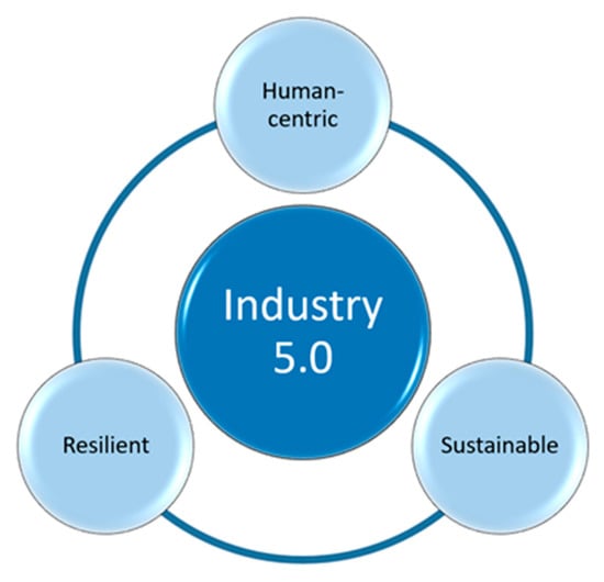 A new industrial paradigm, Industry 5.0, appeared very soon after Industry 4.0 and triggered a debate about the role of, and reasons for, applying the new paradigm. The Industry 4.0 is based on the concept of smart factory, where smart products, machines, storage systems, and data unite in the form of the cyber-physical production systems [8,9]. In the technical aspect, Industry 4.0 has improved the human–machine interaction, but in the socially sustainable aspect, technological transformations of Industry 4.0 should carefully consider the central role of humans [10]. The role and importance of employees was emphasized during the COVID-19 pandemic, and the pandemic itself triggered rethinking of the Industry 4.0 paradigm [11,12]. Consequently, the idea of Industry 5.0 appeared as the extension to Industry 4.0 with social and environmental dimension [13]. On the one side, Industry 5.0 is focused on the workers’ skills, knowledge, and abilities to cooperate with machines and robots [14,15], and on the other side, on flexibilities in production processes and environmental impact.