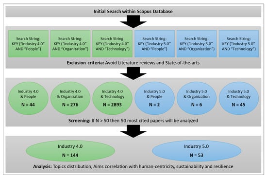 Therefore, a search was carried out within the Scopus database to explore papers related to Industry 4.0/5.0 and three most important enablers: people, organization, and technology (Figure 3). The literature reviews and state-of-the-art papers were excluded from the search.