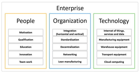 From the practical real-life perspective, some of the manufacturing industry analyses were used. The analysis of Industry 4.0 implementation in the German manufacturing industry by Veile et al. [47] was inspired by Oks et al. and used the same focus on humans (people), organization, and technology. Furthermore, in the analysis of Croatian manufacturing companies, the questionnaires were given to CEOs to identify basic objectives, main priorities, and the most important aspects regarding how to move towards new industrial paradigms [48]. Again, profound analysis of the results collected with questionnaires identified people, organization, and technology as key enablers [49]. As mentioned, studies have pointed out that each of the three enablers has its important subareas. The most important of them are shown in Figure 4.