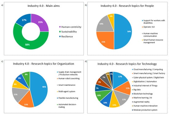 Figure 5 summarizes the literature review on Industry 4.0 in relation to people, organization, and technology. The research topics of each enabler were identified and their distribution is presented. Furthermore, the main research aims of analyzed papers were identified in correlation with drivers of Industry 5.0: human-centricity, sustainability, and resilience (Figure 5a).