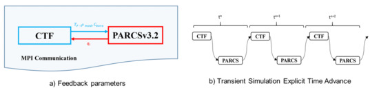 - For transient simulations, a temporally explicit coupling scheme has been adopted. Therefore, the neutronic and thermal-hydraulic conservation equations are not solved altogether, but each code solves its own system of transient equations using the most limiting time step size of both codes. This explicit client/server coupling scheme is presented in Figure 5b. The temporally explicit methods are usually adopted when coupling thermal-hydraulics with neutron kinetics because the numerical stability is always preserved. Although it is widely adopted, the temporally explicit coupled methods have two main inconveniences. The first issue is the numerical diffusion, as each of the coupled physics relies on the solution of the other physics at the previous time step. The second inconvenience is the limitation of the time step size, as all the coupled codes must adopt the smaller time step size between all the involved physics.
