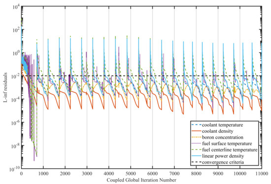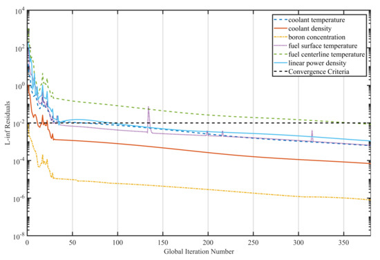 - In steady-state mode, a simple Picard iteration scheme [14] has been adopted. This method implies the construction of an outer convergence loop to check for global convergence of the coupled code and as many local convergence loops as physics are being coupled together. These nested loops represent the global coupled convergence. In this method, the convergence of the thermal-hydraulic code has to be fully met before providing feedback to the neutronic code. The neutronic code then uses the thermal-hydraulic feedback to resolve the neutron flux distribution until its own convergence criteria are met. The global coupled code convergence is tracked by the residuals of the feedback parameters using the and norms of each parameter until the defined tolerance is reached. The and norms are defined in Equations (3) and (4), respectively, where is the cell number, is the total number of cells, is the index of the residual of a given feedback parameter, and is the total number of residuals. is the residual of the feedback parameter in the cell for the current iteration, which is computed as , among which is the current iteration number. The coupled code steady-state convergence behavior is illustrated in Figure 6.