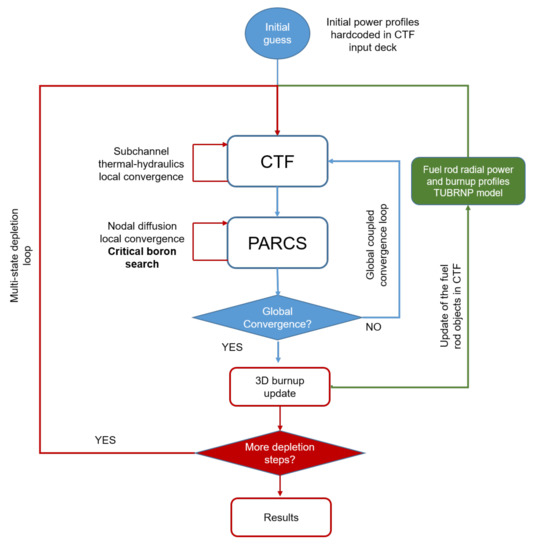 - In depletion mode, a multi-state simulation procedure is initialized in the core simulator. The number of states of this multi-state mode is defined by the number of depletion steps set in PARCS input. At the beginning of each state, the 3D burnup distribution is sent from PARCS to CTF to initialize the burnup-dependent models and material properties in the fuel rod objects. After this initialization, the Picard iteration global convergence scheme is used in the same way as in steady-state simulations. It must be noted that the boron concentration is not feedbacked from CTF to PARCS in depletion mode, as the critical boron is the parameter varied by the latter to find the criticality of the core. This multi-state iterative procedure is represented in the scheme of Figure 7. The global convergence of the developed core simulator in depletion mode can be analyzed by looking at the norms presented in Figure 8. In Figure 8, it can be observed that the global convergence is longer in the first iteration because the initial conditions are far from the real solution. All the remaining states converge with a similar convergence ratio. Each peak on the residual represents the beginning of each state. The peaks are large due to the change in the 3D burnup distribution in the core.