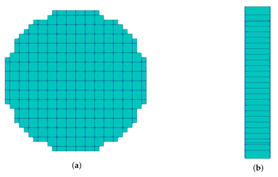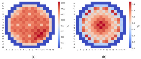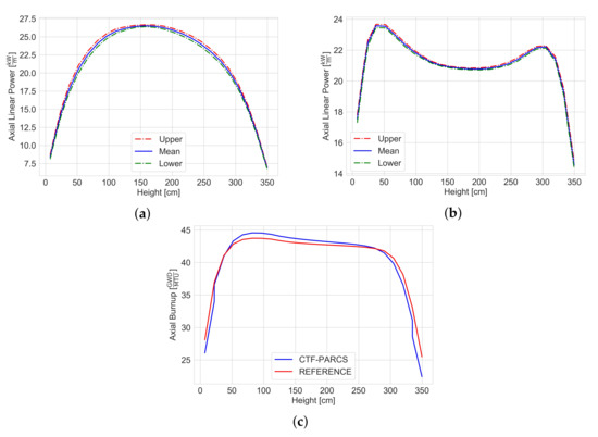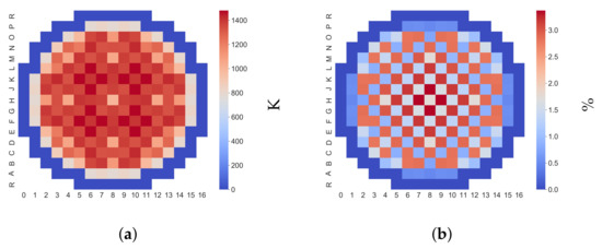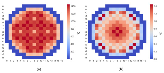 - The first development is the possibility of defining customized ways to compute the Doppler fuel temperature. This effective fuel temperature can be defined as a linear combination of the pellet radial average temperature (), the fuel surface temperature (), and the fuel centerline temperature (), as shown in Equation (5). The parameters , , and are defined by the user in the coupling interface input file.This allows the user complete flexibility on the definition of the effective temperature. Typical effective fuel temperature formulas found in the literature that can be reproduced with this development are the Rowlands [33], as shown in Equation (6), and the Santamarina [34], as shown in Equation (7).