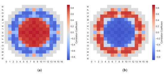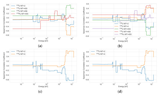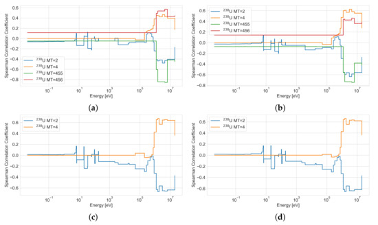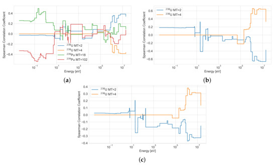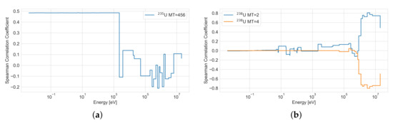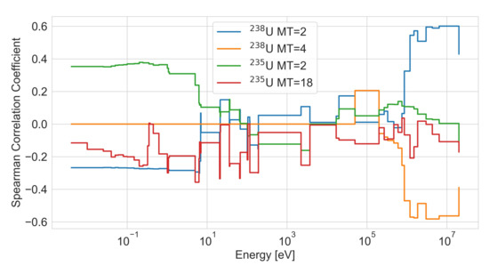 - The first aspect is the statistical noise. Due to the limited number of samples, even independent quantities can be correlated up to some degree. For this reason, a cutoff threshold needs to be determined in order to screen out all the correlations that are within the statistical noise. To calculate the cutoff threshold, a very simple brute force approach is performed. For a predefined number of iterations , in each iteration, two standard normal variables are sampled independently with the intended number of samples . The correlation between these two variables is then estimated and stored. This results in a vector of correlations of size that represents a distribution of empirically estimated correlations of independent variables and thus can be used to derive a cutoff based on some statistical measure. The percentile is considered in this work as the cutoff. As we are going to see later, samples were used, and the calculated cutoff threshold was found to be . This means that any correlation that, in absolute value, is larger than is considered as statistically significant. The cross-sections that show at least one group to be statistically significant are analyzed at all their energy groups, as shown in the uncertainty quantification results section, in order to better understand the energy dependence of the estimated correlations.
