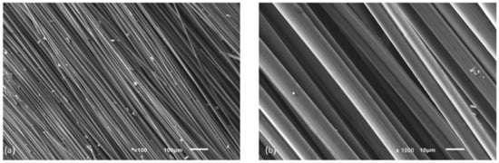 SEM images of long carbon fibers K1100 typically used for the preparation of carbon preform: (a) 100× magnification image; (b) 1000× magnification image (IMMS SAS).