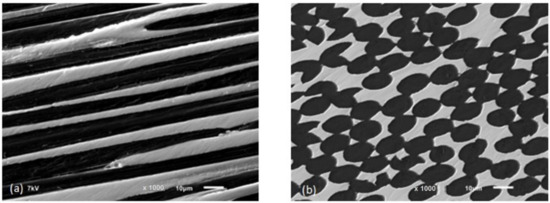 SEM microstructure of prepared Cf/Cu composites: (a) longitudinal to fibers; (b) perpendicular to fibers (IMMM SAS).