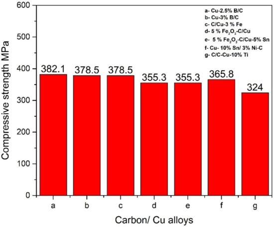 C/Cu-3wt.% Fe is very close to the highest compressive strength, which is slightly below 380 MPa, with copper alloying with 10wt.% Titanium, on the other hand, resulted in low compressive strength around 320 MPa. In terms of flexural strength, the results were vice versa. The strength of Ti alloyed Cu composites was higher. Two different Cu-10wt.%Ti/C composites exhibit different flexural strengths and this can be explained by the differences in production processes leading to different microstructures and interfaces [39,40,49].