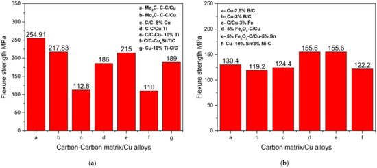 (a) Flexural strength of C/C matrix-Cu composites (a: [44]; b: [43]; c: [55]; d: [38]; e: [39]; f: [45]; g: [40]); (b) carbon matrix/Cu composites (a: [47]; b: [48]; c: [49]; d: [52]; e: [53]; f: [54]).