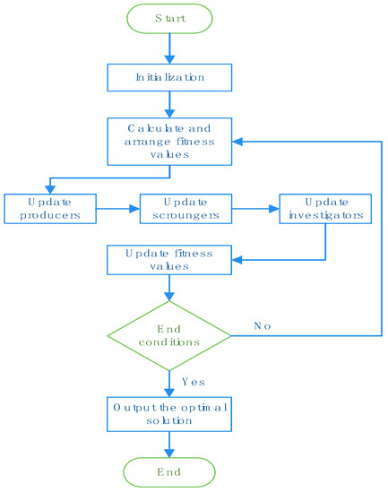 According to the foraging and antipredation behaviors of sparrows, Xue proposed a new swarm intelligence optimization algorithm called the SSA in 2020 [41]. The SSA has a strong global search ability, good stability, and a quick convergence rate. It is not restricted by the objections of function differentiability, derivability, or continuity. The rules of sparrow behavior are usually assumed as follows [45,46,47].