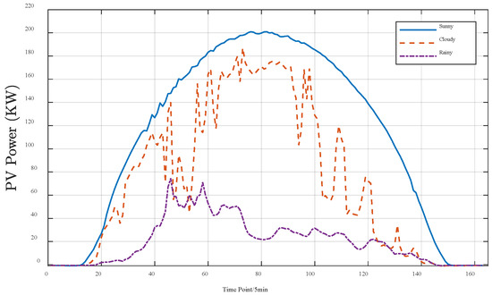 This paper selected a day with different weather types (including sunny, cloudy, and rainy) for the comparative analysis of the actual PV power. Figure 4 picks three days with different types of weather, and one can see that PV power is relatively stable and large in sunny weather, which shows strong regularity. Correspondingly, PV power is not as stable as on sunny days due to cloud cover in cloudy weather. It is clear that the PV power is relatively small, fluctuating, and less regular in extreme rainy weather.