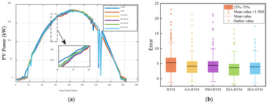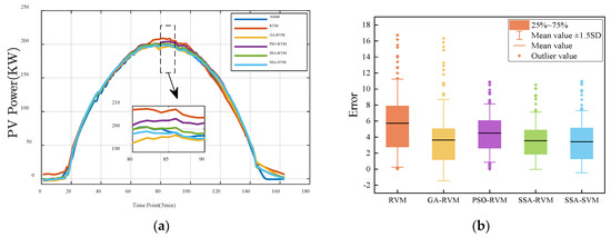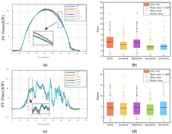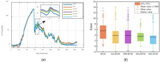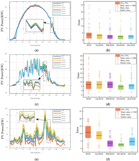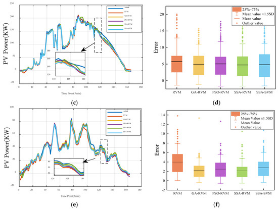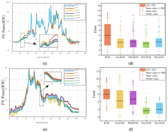 The predicted PV power curve in winter is shown in Figure 8. Compared with other seasons, the PV output power in winter is generally lower, and there is a small gap between the predicted and the actual results under various weather conditions. On sunny days, the fluctuation of PV output power is gentle. One can clearly see from Figure 8a that the prediction power curve of the GA-RVM and the PSO-RVM show noticeable fluctuation. The prediction curve of the SSA-RVM and the SSA-SVM is the closest to the actual value. Figure 8b shows the error. The mean value of the SSA-RVM is the lowest among other methods. From the comparison of power curves, under sunny and cloudy weather, the prediction results of different models are close to the actual value, but under rainy weather, due to significant changes, the prediction result of the SSA-RVM used in this paper is the closest to the actual value, and others have a larger difference. From Figure 8b,e,f, the mean value of the SSA-RVM method is lower, and the outlier value is less than the other methods.