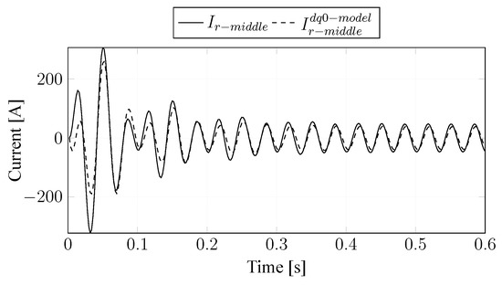 Simulation results of the phase a current response of the BDFIM’s -rotor-reference frame model (12-state model) compared to the -reduced model (8-state model) and the synchronous model (8-state model).