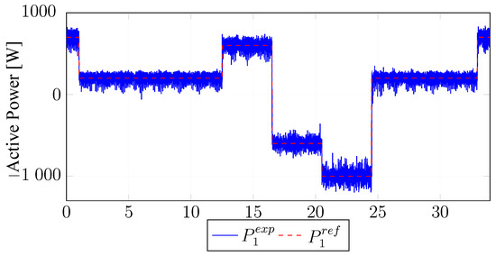 In Figure 11 and Figure 12, respectively, the controlled active and reactive power of the machine while transitioning between generation and motoring modes can be observed. It can be observed that the controller sufficiently tracks the reference powers. Through physical tests, it was found that the observable noise level in the figures is due to sensor noise that was caused by the modified inverter. In the future, a converter with less noise, operating at a higher frequency, can be used to reduce the noise. However, the noise does not affect the conclusion on the performance of the control method.