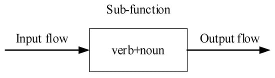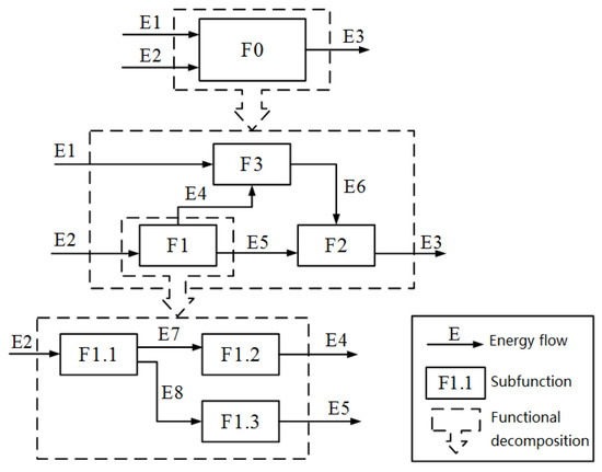 After determining the focused performances for electromechanical products, functional decomposition can be carried out based on Paul’s method of function–structure analysis to form relevant function tree. During functional decomposition, a more detailed relationship between function and energy is supposed to be built step by step with the energy action in the process of realizing functions at all levels of the considered function tree, as is shown in Figure 9. Function F0 is decomposed into F1, F2 and F3 while F1 is decomposed into F1.1, F1.2 and F1.3, and each function is linked through energy flow.
