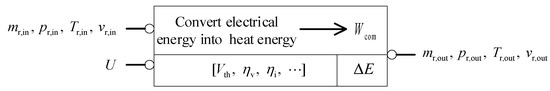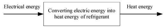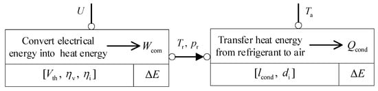 In order to better elucidate the EFE model, the compressor, one of the three types of EFE models, is taken as an example. Firstly, from a functional basis point of view, a compressor can be represented as shown in Figure 3 in the conceptual design stage. Its function is to convert electrical energy into heat energy of refrigerant. Obviously, according to functional basis, what determines its function is the conversion and transfer of energy, that is, the content described in the “verb” part. However, what makes a critical difference to performance response in EFE model is a compressor’s quantitative characteristics. As a result, the actual physical form of a compressor, such as theoretical volumetric capacity Vth, volume efficiency and isentropic efficiency , needs to be defined to establish the EFE model of the compressor, which contributes to the transition from functional design during conceptual design stage to detailed design (Figure 4).