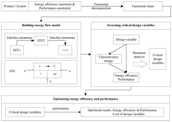 In the last decades, there have been many methods to support product design and energy efficiency improvement based on energy. Some of these, such as functional basis and bond graph, have been presented during the conceptual design stage and cannot be applied to the detailed design stage since none of these quantitatively developed a relationship among design variables, energy flow and performance. While other methods based on energy during the detailed design stage tended to improve energy efficiency within the limited scope of parts design, or under a single performance constraint. In our paper, we attempted to link the conceptual design and detailed design with an energy flow model which contributes to ascertaining how various design variables impact the response of energy efficiency and performance to instantly support performance matching. Therefore, the energy flow model is conducive to support energy efficiency improvement at the product or system level.