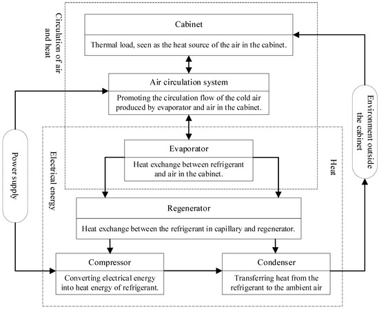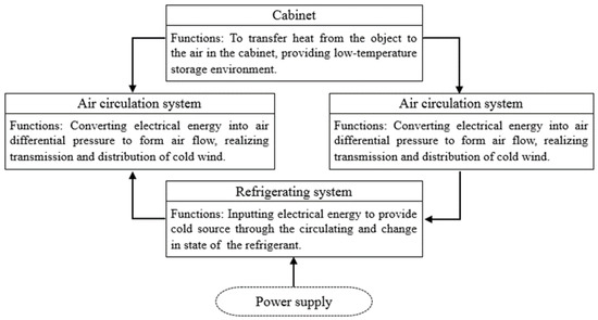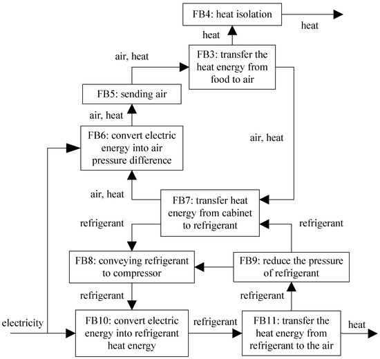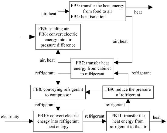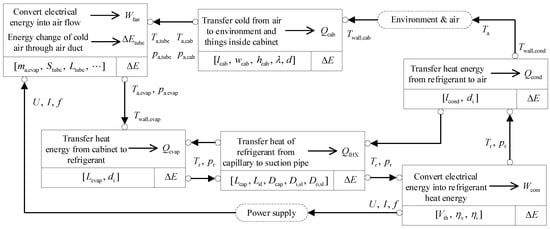 The purpose of energy flow model is to support performance design by connecting performance and relevant design variables under energy efficiency and performance constraints with energy being a bridge. The detailed process of how a compressor EFE model is established is shown in Section 2.2. In addition, energy flow analysis of other functional modules, and establishment of other EFEs, are similar. Combining EFE model and functional chain, an energy flow model of the refrigeration system under energy efficiency and refrigerating capacity is shown in Figure 16.