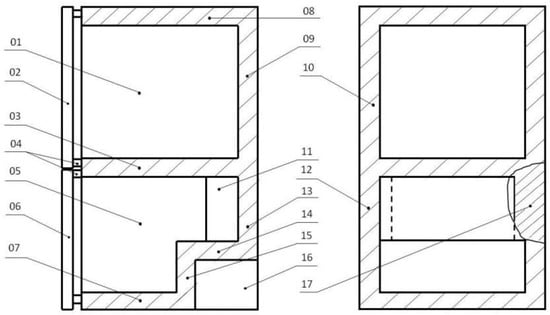 Structural diagram of refrigerator prototype box. 01 Refrigeration cabinet; 02 door of refrigeration cabinet; 04 door gasket; 05 freezing cabinet; 06 door of freezing cabinet; 11 evaporator chamber; 16 compressor chamber; 03/07~10/12~15/17 thermal-protective coating.