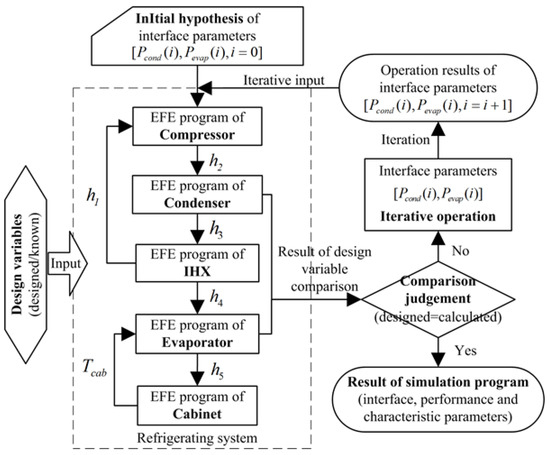 Based on the energy flow model of the refrigerating system, a simulation iterative process of refrigeration performance on account of EFE was built for this paper, as is shown in Figure 18. The refrigerator running state is described by the energy flowing among EFEs and the energy is represented by the thermodynamic enthalpy for the refrigerator’s refrigeration performance. In order to determine whether the refrigerator is running in steady state, the target temperature of compartments, condenser and evaporator are chosen as criterion parameters in the simulation iterative process. Once an iteration is completed, the refrigerator is considered to be in a stable state. Performance index parameters and corresponding design parameters which can support simulation analysis for performance matching are the outputs of the program. Moreover, the characteristic energy is also calculated in the results and can be used to evaluate realization of function and performance.