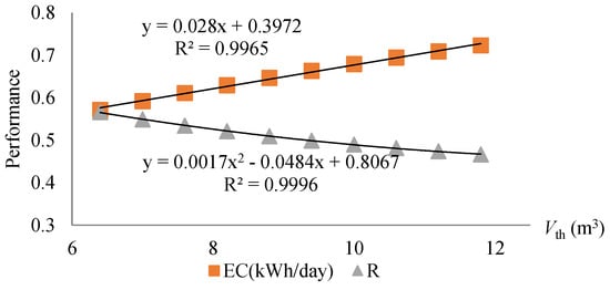 The influences of compressor theoretical volumetric capacity Vth on each EFE characteristic energy and performance are calculated via steady-state performance simulation of the refrigeration system and are shown respectively in Figure 19 and Figure 20. As is seen in the figures, theoretical volumetric capacity has a great influence on ECday and R. With theoretical volumetric capacity increasing, the performance of all EFEs is improved while the efficiency of the whole machine decreases, which leads to a significant increase in power consumption. That is, although the increase of theoretical volumetric capacity leads to the decrease of the operating rate, the day-power consumption of electricity still increases.