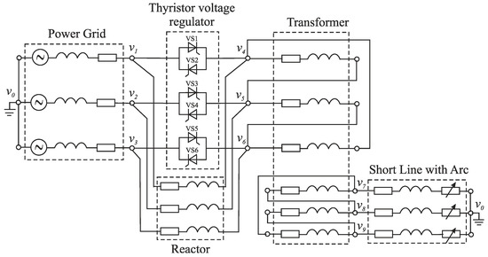 The scheme is formed by connecting the outer circuits of multipole elements, namely: three-phase network, controlled reactor (represented by a combination of thyristor voltage regulator and three-phase inductor), transformer and three-phase short circuit with an arc. The outer circuits of these multipolar elements are interconnected at the nodes of the system. The potentials of the independent nodes of the system are denoted as ν1–ν9.