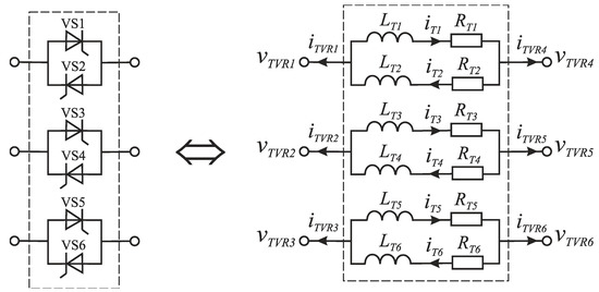 To create a mathematical model of the power circuit of a thyristor voltage regulator (TVR), we make the following assumptions, which are characteristic of the well-known method of modeling power circuits of semiconductor converters as circuits with a constant structure and variable parameter. Each thyristor is represented by an electrical circuit of series-connected impedance and inductance. Their values for the switch-on state are taken so that the inheritance of the on-voltage on the circuit corresponds to the inheritance of the voltage on the switched-on thyristor, and the values for the switch-off state such that the current circuit can be neglected. The option of simultaneously opening two thyristors in phase is impossible. Thyristor switch-on occurs instantly when the thyristor opening condition, which is specified by a logical expression, is fulfilled. The thyristor switch-off is a step in which the current circuit changes its sign from positive (at the beginning of the step) to negative (at the end of the step), at the moment of the current circuit transition through 0. An increase in the equivalent resistance and inductance of the line at the moment when the line current is equal to 0 corresponds to the physical principles of thyristor operation and ensures the stability of the calculation. Note that the used method is distinguished by increased numerical stability, including parametric changes, which is substantiated, in particular, in [41,42]. Assuming a linear law of current change in step, this point in time can be calculated as