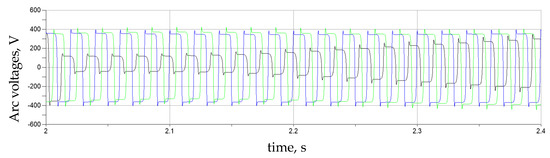 The simulation results were compared with the results of analytical calculations and experimental studies presented in [31]. The results of the calculation for asymmetric perturbation of the arc length mode are shown in Figure 5 and Figure 6. As a result, there was a sharp decrease in arc voltage in phase A (Figure 5) and an increase in current in phase A that affected the value of currents in other phases, where the perturbation in the lengths of the arcs was absent (Figure 6).