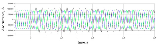 Below are given the results of studies on the perturbation mode of the arc length in one phase, during which there was a sharp decrease in the arc length in phase A. Oscillograms of instantaneous values for arc currents with MTVR regulation as a function of current, in which the alignment of arc currents is noticeable, especially at the beginning of perturbation, are shown in Figure 10.