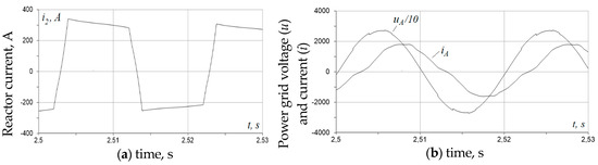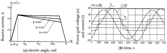 On the basis of an analytical description in [31], time diagrams for the choke current for different values of γ = Rr/Xr, as well as the mains current, are drawn (Figure 7). In this case, the assumption of a trapezoidal form for the choke current is accepted. In Figure 8, for comparison, the same values are obtained by computer simulation using the developed model. As can be seen, the shape of the choke current and the shape of the mains current according to the results of computer simulation correspond to known analytical dependences. This confirms the adequacy of the developed model for the power circuit with MTVR.