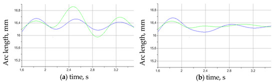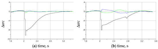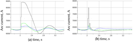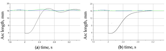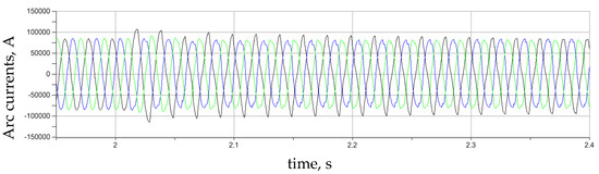 As a result of the perturbation, there is a mismatch signal in the control system of the electrodes (see Equation (18)), resulting in a control signal to move the electrodes, which provides recovery of arc length and operating point of arc combustion (arc impedance). Note that changing the magnitude of arc currents in phases where there are no perturbations causes a mismatch signal in the control system of the electrodes of these phases, which causes incorrect electrode movements and changes in arc length in these phases. Stabilizing the length of the arcs is an important task in the automatic control system.