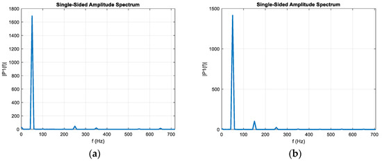 Another research task was to analyze the influence of the thyristor regulator in the high-speed control circuit on the power supply network. Harmonic analysis of mains currents was performed using functions Matlab fft, thd. In Figure 15a, the harmonic spectrum of the mains current in the absence of thyristor-controlled choke for steady-state symmetrical mode is described. In this case, the distortions are insignificant and are due only to the nonlinear nature of the load (arc), as the coefficient of harmonic distortion is equal to THD = 0.2%.