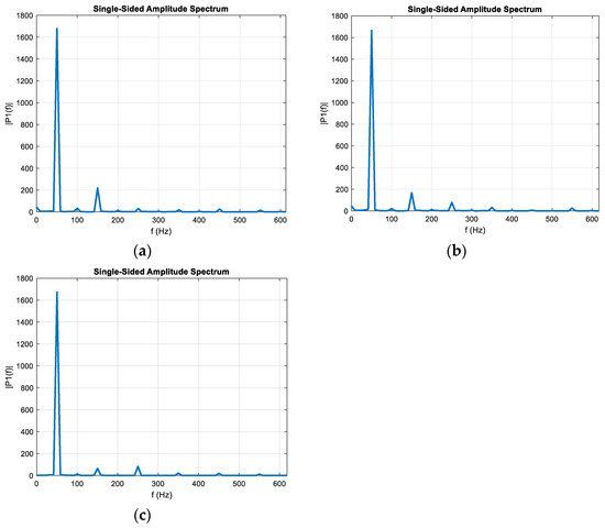 Harmonic distortion in the currents control of MTVR at the beginning of the perturbation (maximum control action): (a)—phase max angle A, max angle 35° (THDA = −1.7%); (b)—phase B, max angle 20° (THDB = 1.22%); (c)—phase C, max angle 5° (THDC = 0.55%).