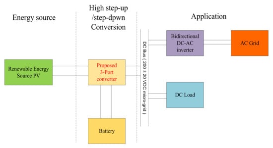 This paper proposes an isolated three-port bidirectional DC/DC converter, the block diagram of which is shown in Figure 2. When the energy supplied from the PV modules is sufficient, the converter can step-up the output of the PV modules and provide energy to the DC bus while charging the battery. However, when the energy supplied from the PV modules is insufficient, the converter can step-up the output of the battery and provide energy to the DC bus. If there is excess energy in the DC bus, it will be used to charge the battery, which means that this topology can run both high-step-up and high-step-down functions.